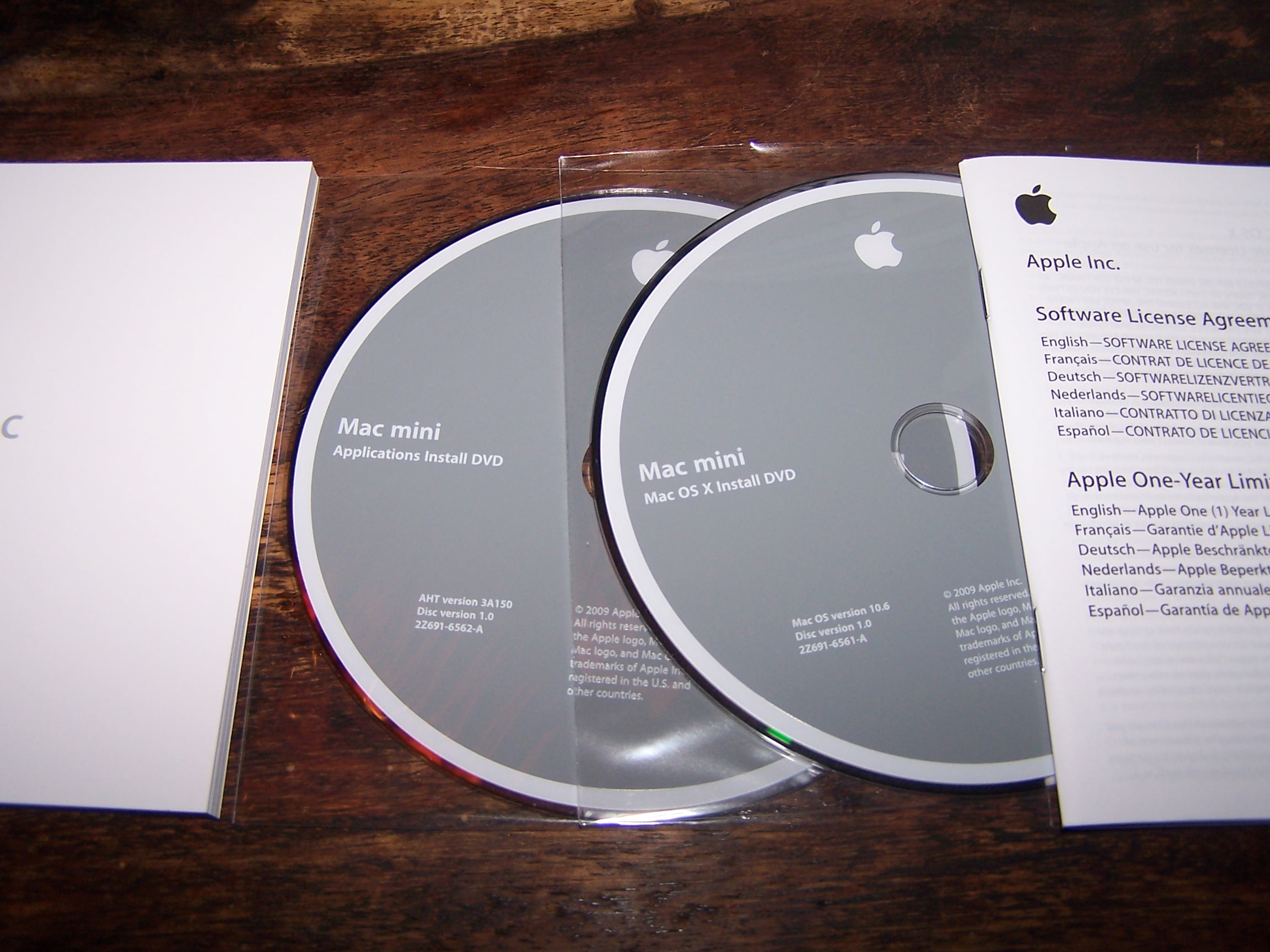 Die Größe des mini ist beeindruckend: Ein Kaffeekannenwärmer ist kaum größer. Das Ding passt wirklich auf den Schreibtisch – auch auf meinen (und sorgt somit für etwas Beinfreiheit, auch nett!). Bei den Anschlüssen wurde auch nicht gespart: 5 mal USB 2 sind echt in Ordnung, es ist ein schneller Firewire-Anschluss vorhanden (was für die m.E. zwingend erforderliche externe Festplatte vonnöten ist) und man hat sogar die Möglichkeit, zwei Monitore am mini zu betreiben. Das ist ein nettes Feature, aber ich denke nicht, dass ich das brauchen werde. Die Box weist wenig Zubehör auf: Es ist die System – und Application-CD dabei, so etwas in der Art einer Kurzanleitung, Das Netzteil und der Bildschirmadapter. Das war es dann auch. Wer einen Mac mini kauft, weiß aber auch, dass er sämtliche Peripherie haben oder zukaufen muss.